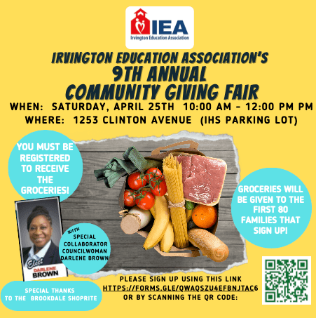 Irvington Education Association's 9TH ANNUAL COMMUNITY GIVING FAIR Saturday, April 25 10:00 a.m. - 12:00 p.m. 1253 Clinton Avenue (IHS Parking Lot) Groceries will be given to the first 80 families that sign up! YOU MUST BE REGISTERED TO RECEIVE THE GROCERIES! CLICK HERE - TO REGISTER