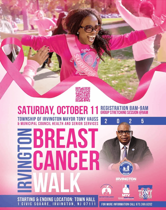 Township of Irvington Mayor Tony Vauss, Municipal Council, along with Health and Senior Services present 2025 Irvington Breast Cancer Walk SATURDAY, OCTOBER 11th, 2025 CLICK HERE TO REGISTER 8:00 AM - 9:00 AM Group Stretching Session 9:00 AM Starting & Ending Location Town Hall, 1 Civic Square, Irvington, NJ 07111 For more information call (973) 399-6202 ... Click Here to Read More